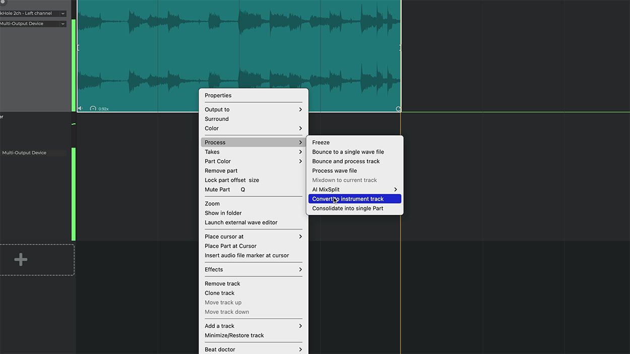 • Another option is to use the Freeze or Bounce command to pre-process a track (i.e. apply effects offline, instead of during realtime playback), which does the same thing as solo-ing a track, using the Export Mixdown command to save it as a wav file and then re-importing the file into a new track and deleting the old track. The new track will now have the effect 'printed' on it so that you can remove the real-time effect