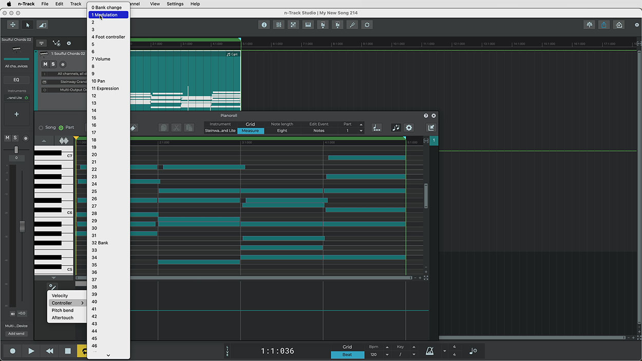 Write or record MIDI using the built-in editors and controllers. Write and edit MIDI notes and velocity with the Piano Roll, play on-screen Drums and Keyboard controllers, or connect external MIDI controllers.